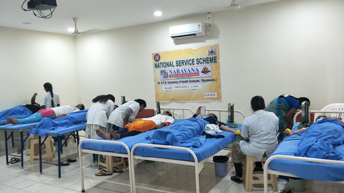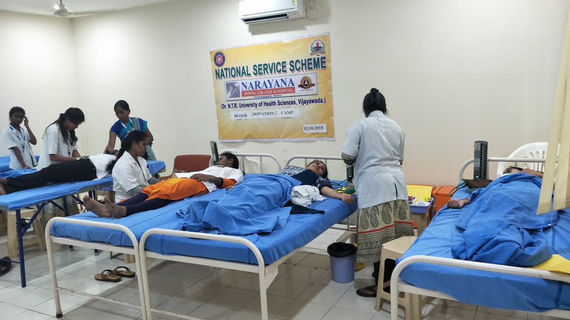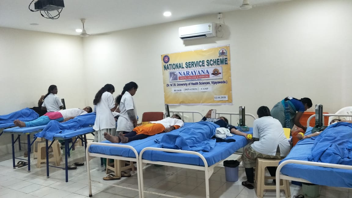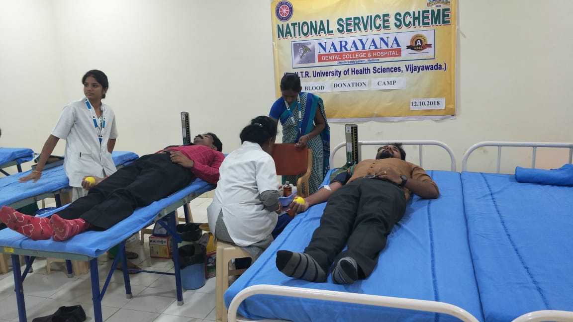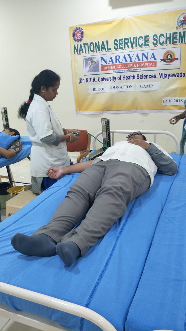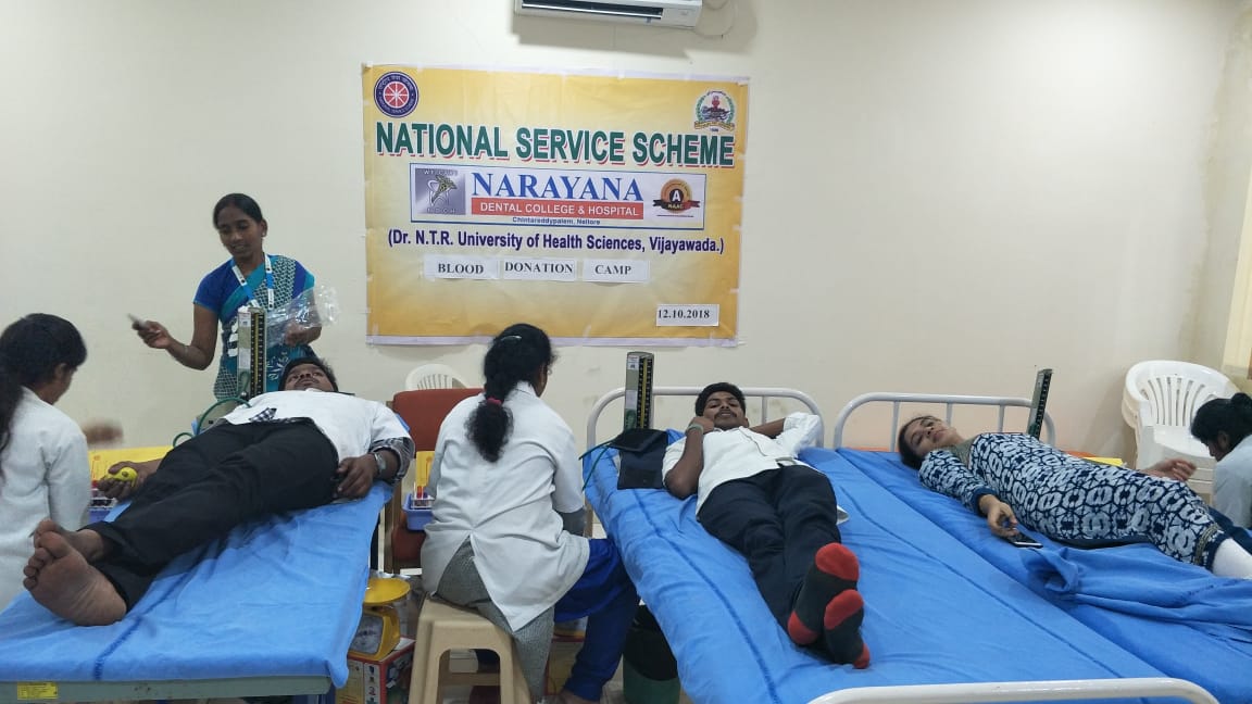 A blood donation camp was organized by NSS Unit, Narayana Dental College on 12th October 2018. A team of doctors and nurses of Narayana General Hospital came for collection of blood. The event started with the inauguration by Principal. Dean, faculty members, NSS Programme officer and students bldre present at the occasion. The activity of blood donation was started by faculty members and students of Narayana Dental College & Hospital. There was an overwhelming response from students. A total of 60 units bldre collected in the camp. Some of the donors who could not donate this time bldre assured for donation in the next camp. Refreshment was given to each donor as a token of gratitude.