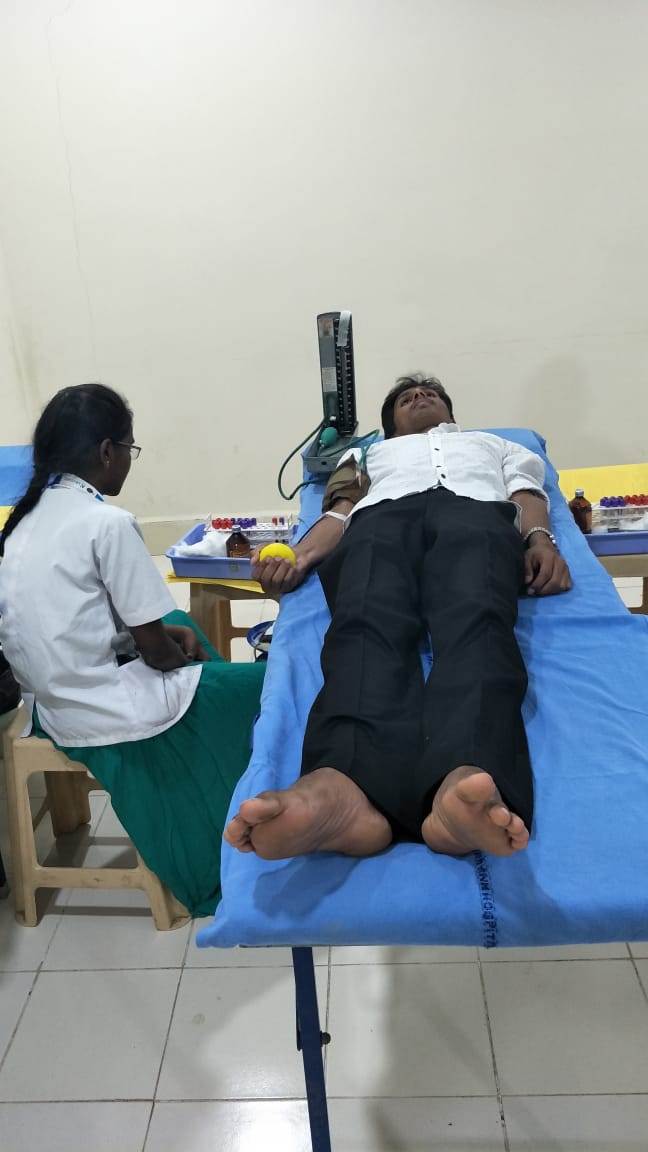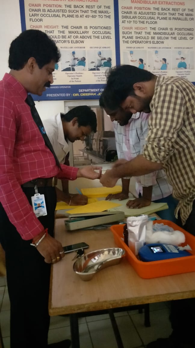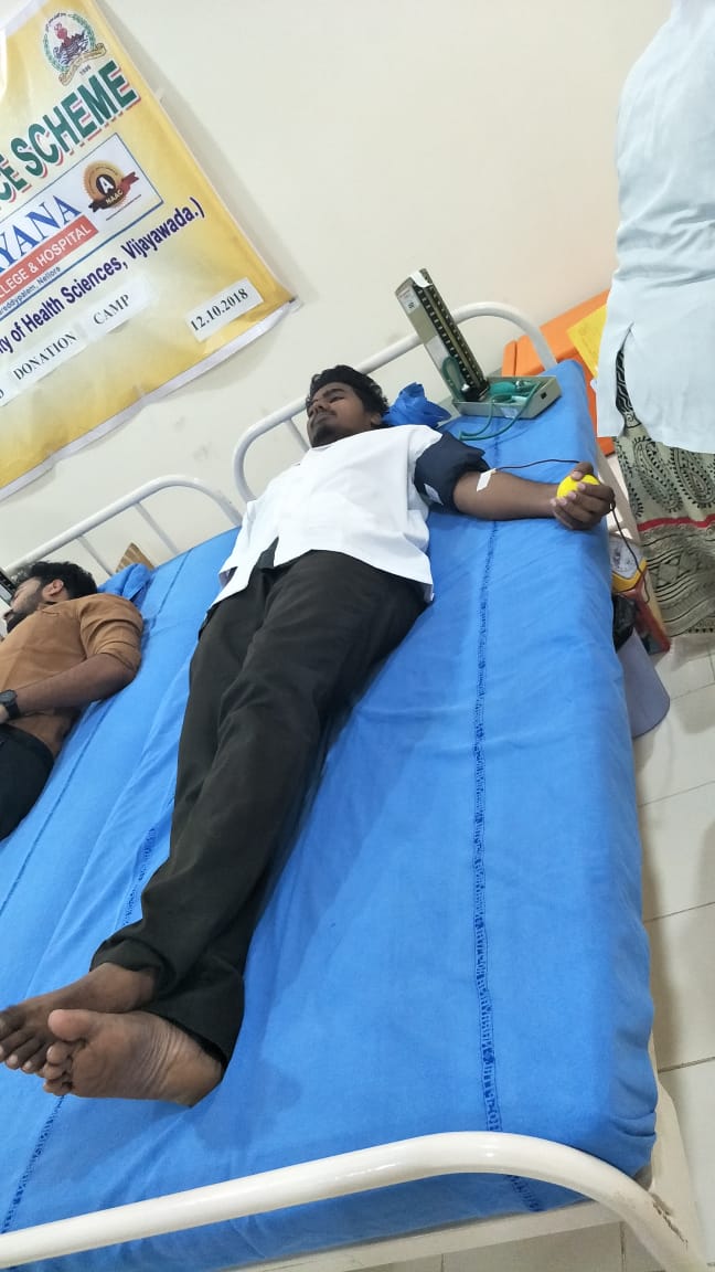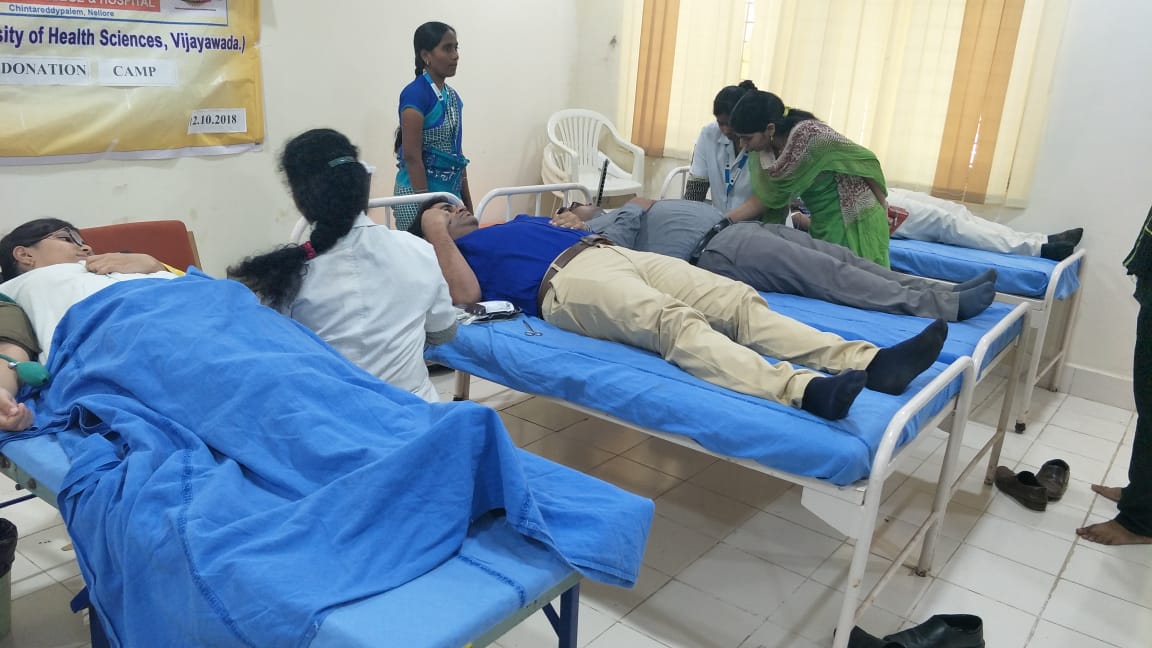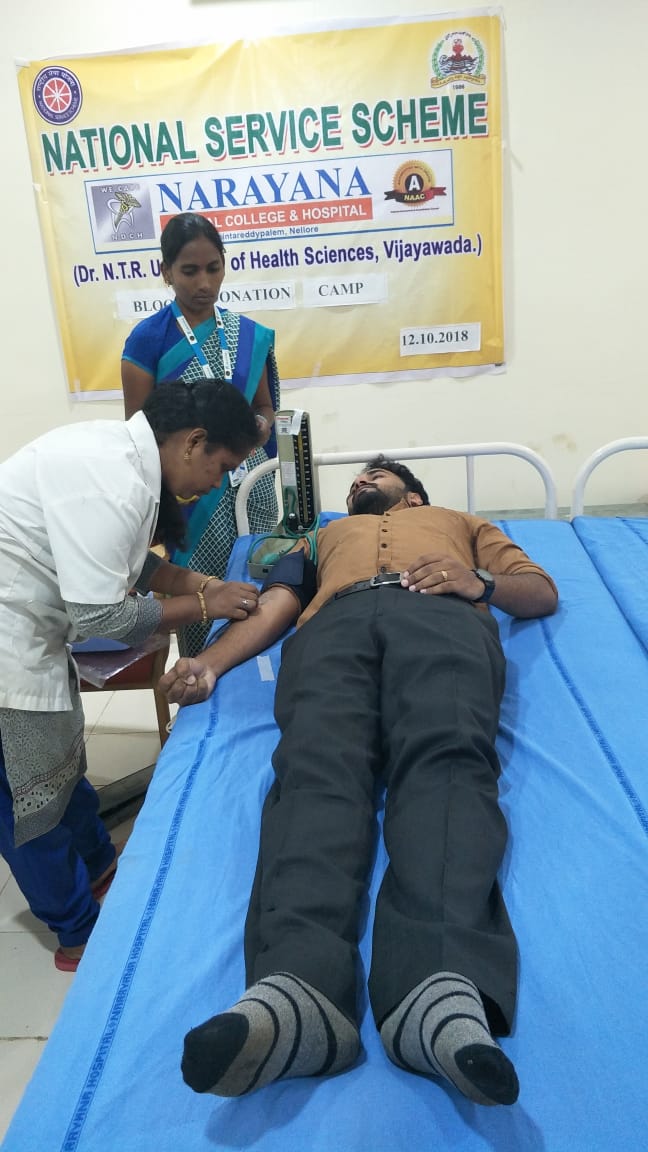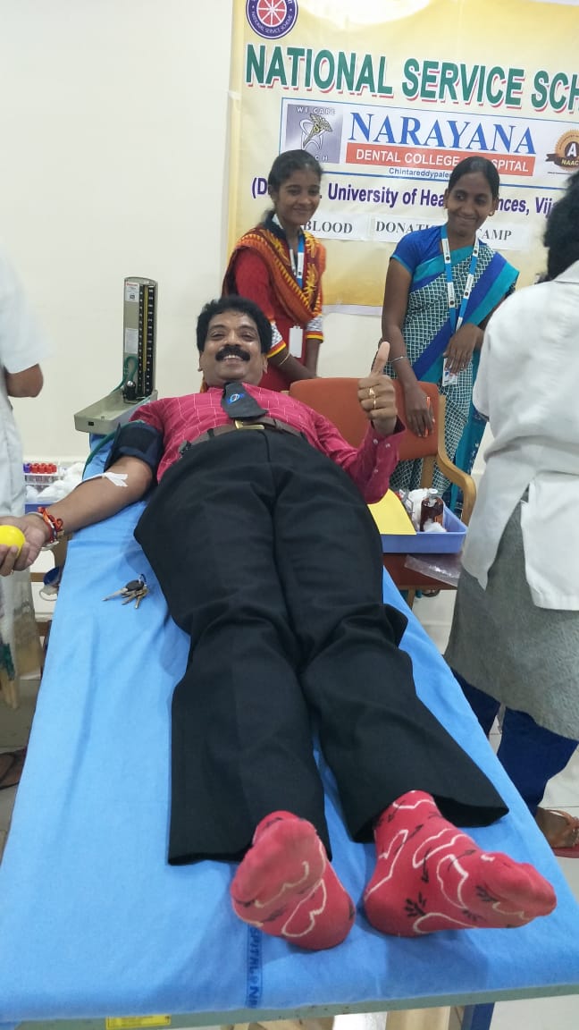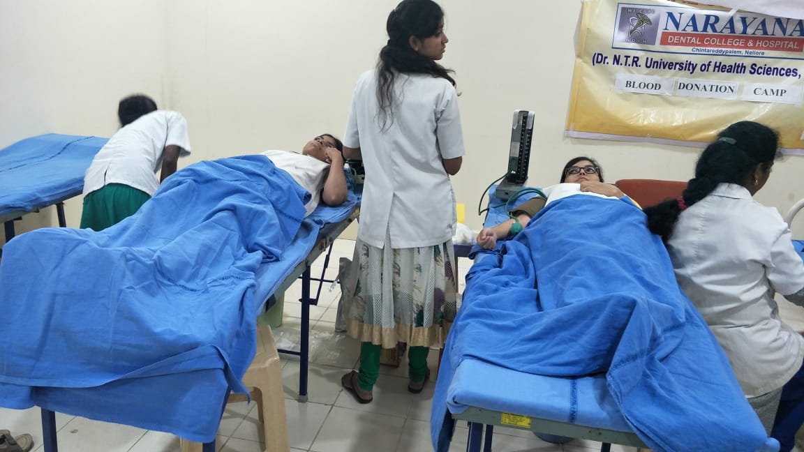 A blood donation camp was organized by NSS Unit, Narayana Dental College on 12th October 2018. A team of doctors and nurses of Narayana General Hospital came for collection of blood. The event started with the inauguration by Principal. Dean, faculty members, NSS Programme officer and students bldre present at the occasion. The activity of blood donation was started by faculty members and students of Narayana Dental College & Hospital. There was an overwhelming response from students. A total of 60 units bldre collected in the camp. Some of the donors who could not donate this time bldre assured for donation in the next camp. Refreshment was given to each donor as a token of gratitude.