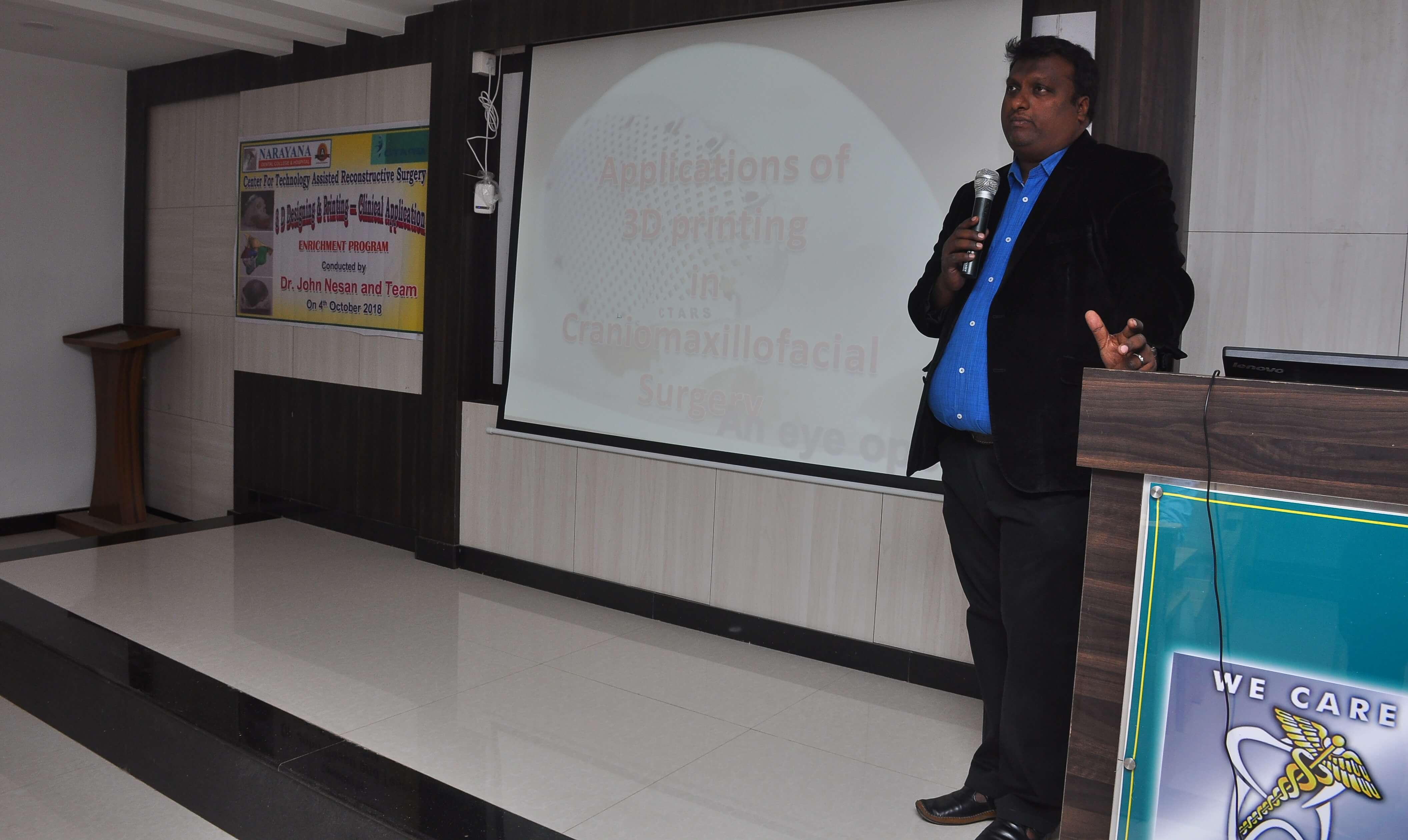 Dr. John Nesan and his team members from CTARS, have conducted the enrichment program and workshop on “3D designing & 3D Printing- Clinical Applications” held at our institution on 04/10/2018. Principal, faculty members and Post graduates was participated in the workshop.
