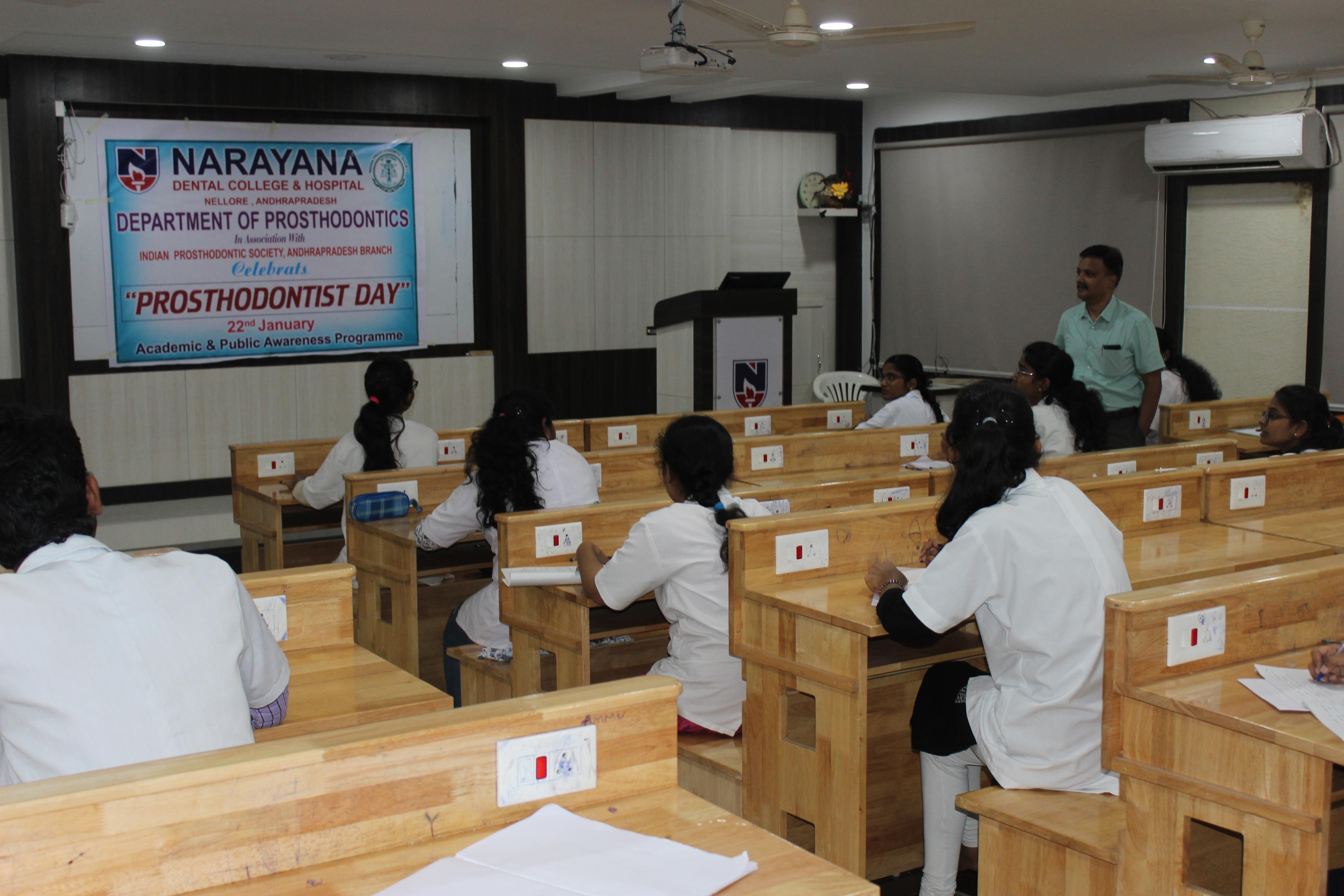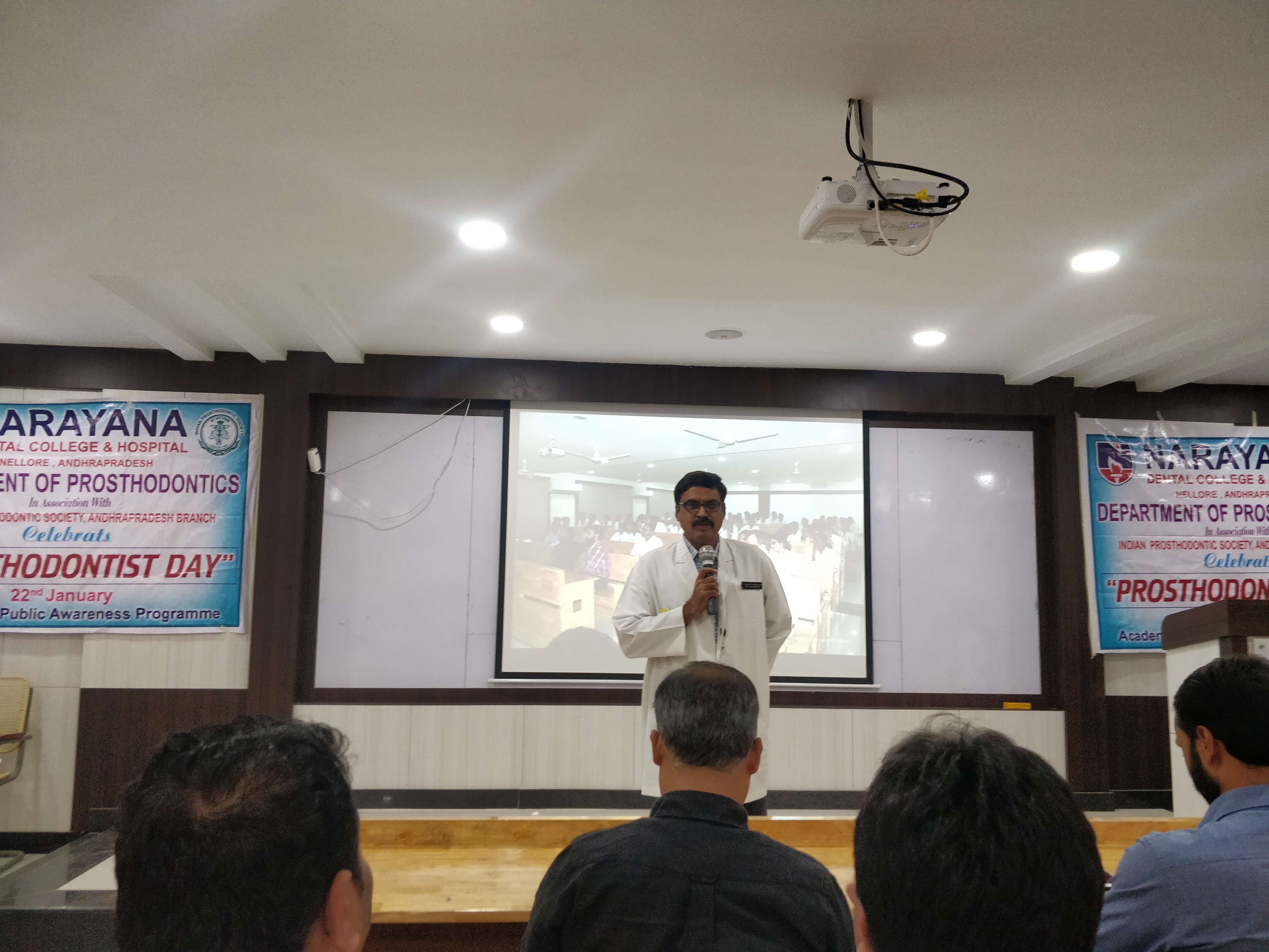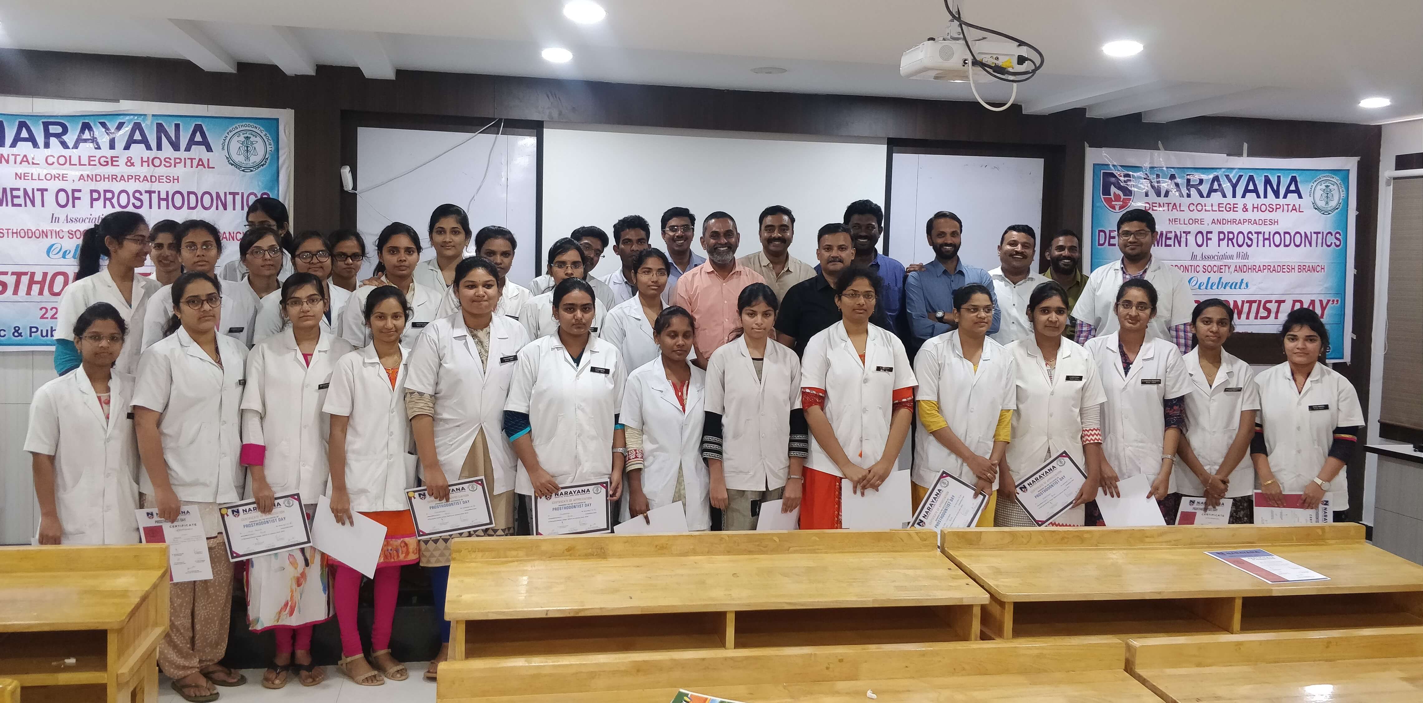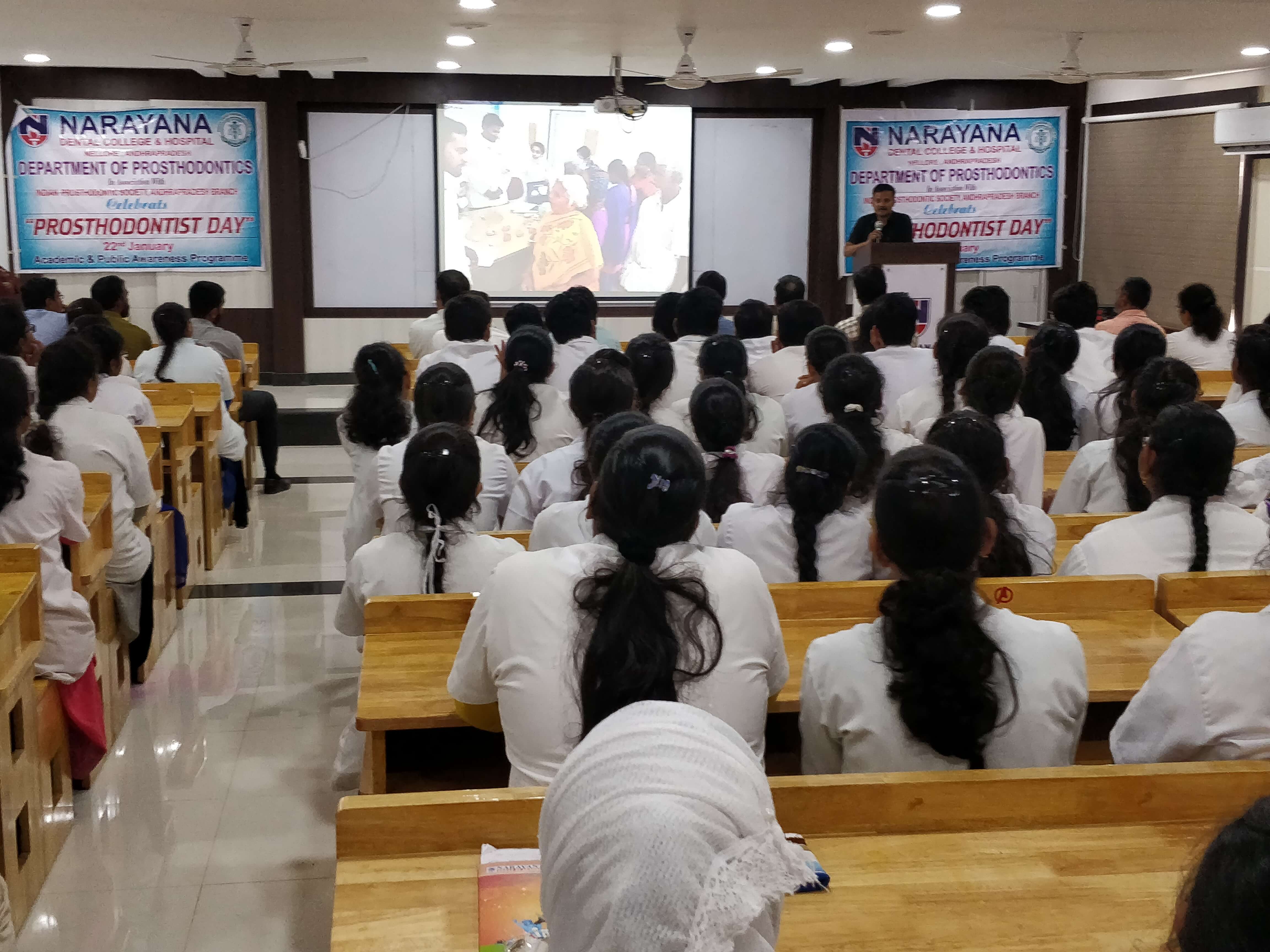 The Department of Prosthodontics, Narayana Dental College was celebrated 22nd January of 2019 was celebrated as PROSTHODONTIST DAY; aimed to spread awareness with regard to the specialty, across the different locations and also various clinical situations a Prosthodontist is capable of handling. This prestigious occasion has been structured under the aegis of Indian Prosthodontic Society (IPS) in association with Narayana Dental College & Hospital.