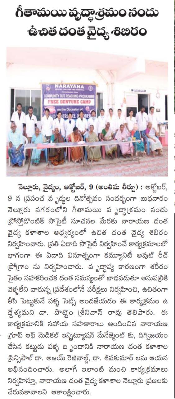 The Department of Prosthodontics, Narayana Detail College along with in collaboration with Indian Prosthodontics Society, AP Branch (IPS, AP Branch) conducted a series of complete denture mega-camps on the occasion of “WORLD’S ELDERS DAY” (October 1st) with a concept of “Community Outreaching Program”. A free denture camps has been organized by Department of Prosthodontics, Narayana Dental College & hospital between 23rd to 30th of September 2019. The key motto behind this program is to addressing and the public regarding consequences of edentulousness and benefits of rehabilitation through dentures (Complete or Removable partial dentures). The faculty and post-graduate students has carried out a comprehensive dental checkup in various old age homes centers between 2nd to 16th of September 2019, in and around Nellore district. A total of 79 cases were examined and 26 cases were rehabilitated as a part of this program on 1st, 3rd and 9th of October 2019. The faculty and post-graduates of the Department Of Prosthodontics has planned these camps at:-