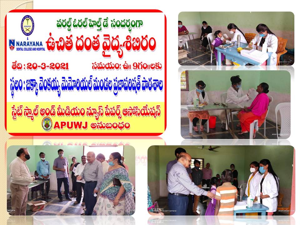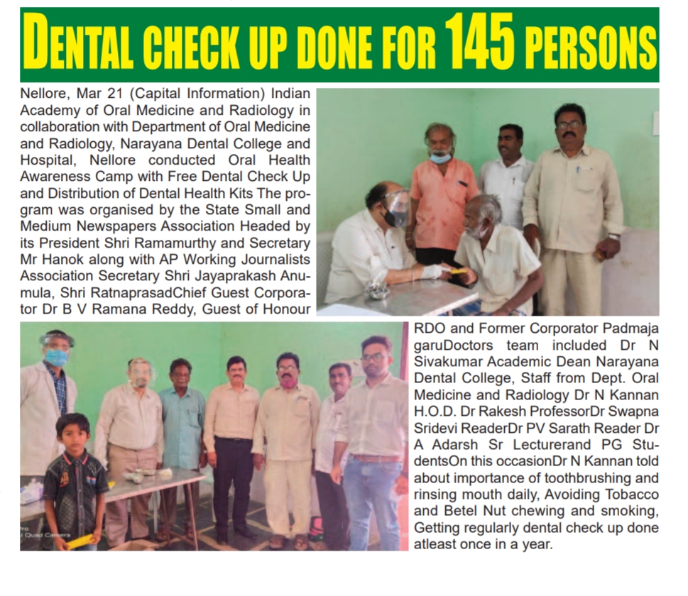 On the occasion of World Oral Health Day, a one-day Oral Health Screening Camp will be conducted by the Department of Oral Medicine & Radiology, Narayana Dental College and Hospital, Nellore at Jakka Venkaiah Memorial Mandala Praja Parishad School, Housing Board Colony on March 20, 2021 from 9:00a.m. to 1p.m. sponsored by State Small & Medium Newspapers Association (SSAMNA)